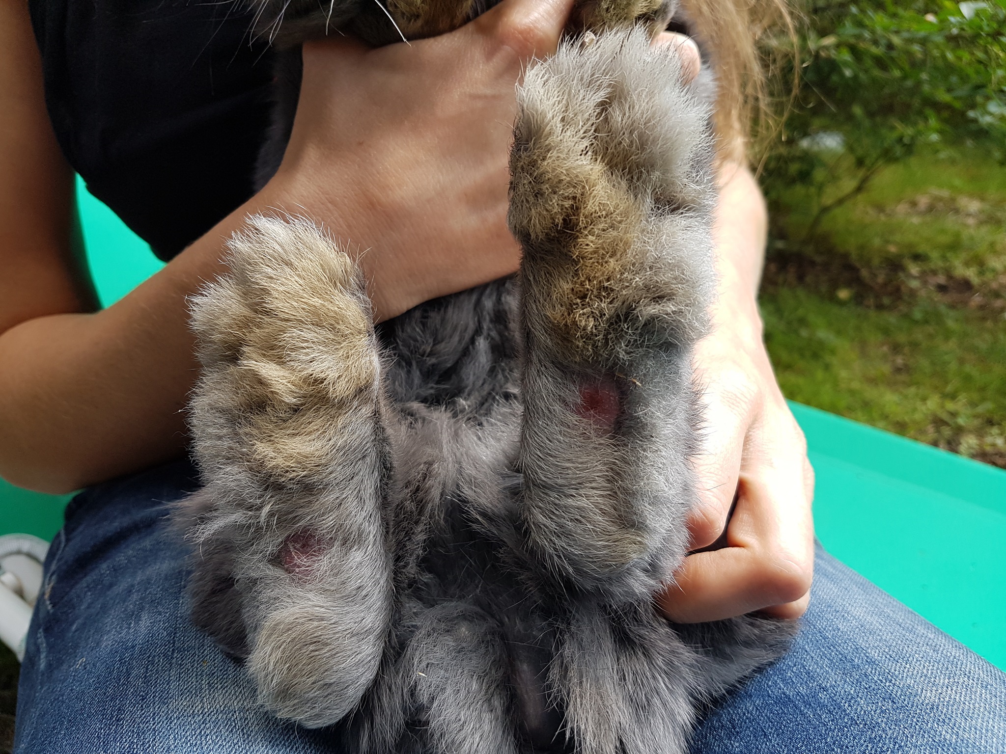 Sofern die Kaninchen nicht bereits rund um die Uhr mehrere Quadratmeter Fläche zur Verfügung haben, muss dies spätestens jetzt dringend nachgeholt werden - denn Pododermatiden sind im Prinzip "Sitzschwielen"; während beim Sitzen ein großer Teil des Körpergewichts auf den hinteren Fußsohlen lastet, kommen beim Hoppeln lediglich die Zehen mit dem Boden in Kontakt. Hoppeln ist daher die optimale Schonung für wunde Füße!