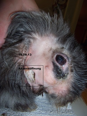 Oberkieferabszesse hinter dem Augapfel lassen sich in manchen Fällen nicht beseitigen, ohne dabei auch das Auge zu entfernen, da die Operation evtl. nicht aus der Maulhöhle heraus, sondern von außen erfolgen muss. Einige Chirurgen haben jedoch Erfahrung darin, diese sogenannten retrobulbären Abszesse "am Auge vorbei" zu entfernen, sodass es erhalten werden kann - abhängig davon, ob und wie stark es bereits geschädigt wurde. Diese OP-Technik ist natürlich wann immer möglich zu bevorzugen - sodass es sich lohnt, explizit nach einem Tierarzt zu suchen, der sie beherrscht!