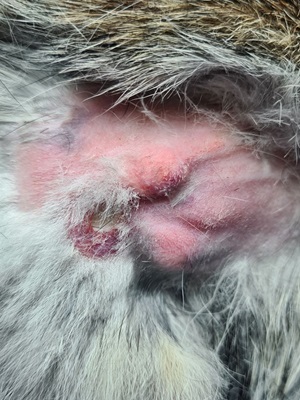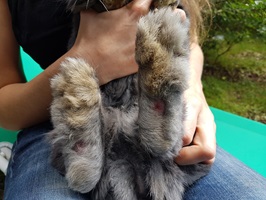 Achten Sie unbedingt auch auf eine gute "Polsterung" der Fußsohlen. Das Fell sollte mehrmals täglich "aufgeflauscht" und bei Bedarf gekämmt werden, Verfilzungen müssen umgehend vorsichtig mit den Fingern oder einem Flohkamm gelöst werden. Keinesfalls dürfen grundlos Haare entfernt werden! Damit ginge die allgemein, ganz besonders aber bei bereits vorhandenen Hautproblemen wichtige Polsterfunktion verloren und das Kaninchen säße mit den "nackten" Wunden auf dem Boden.