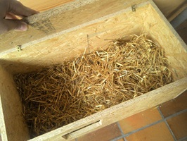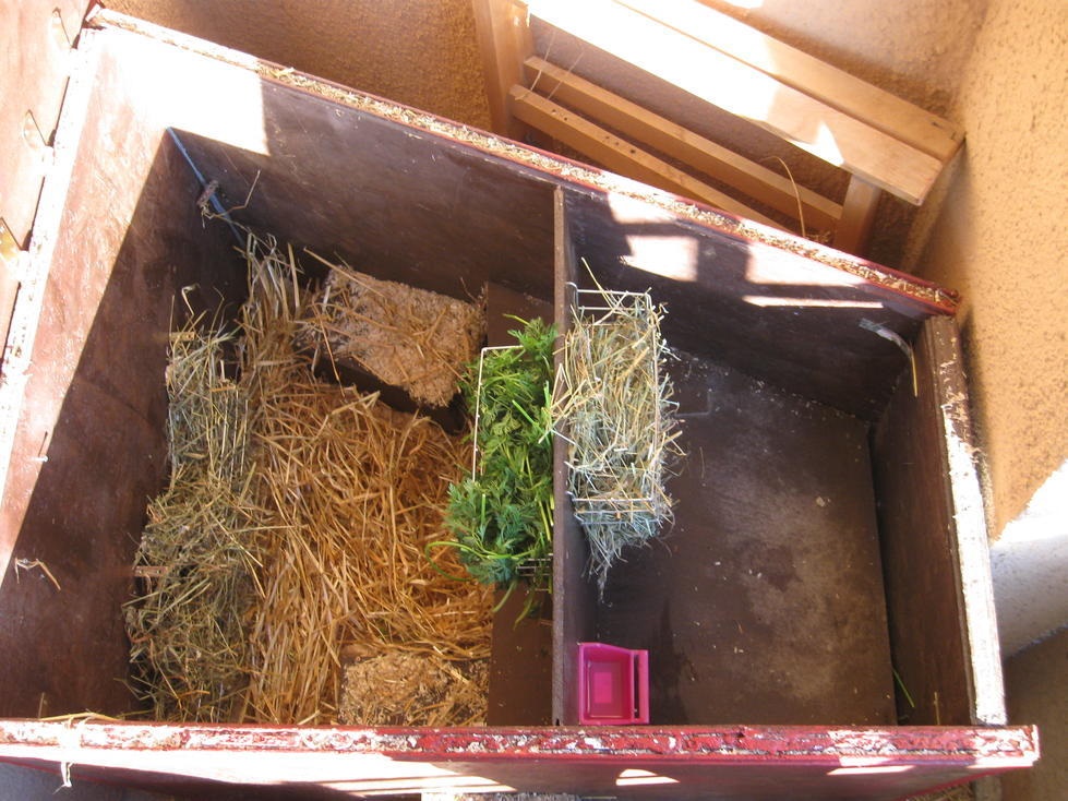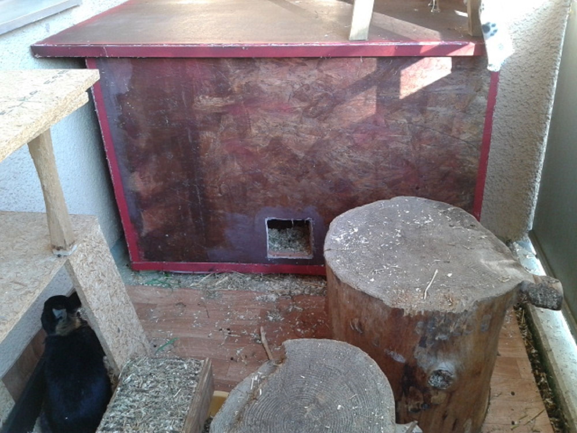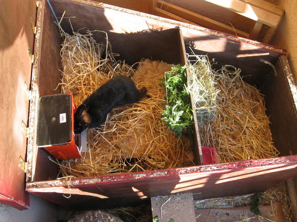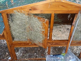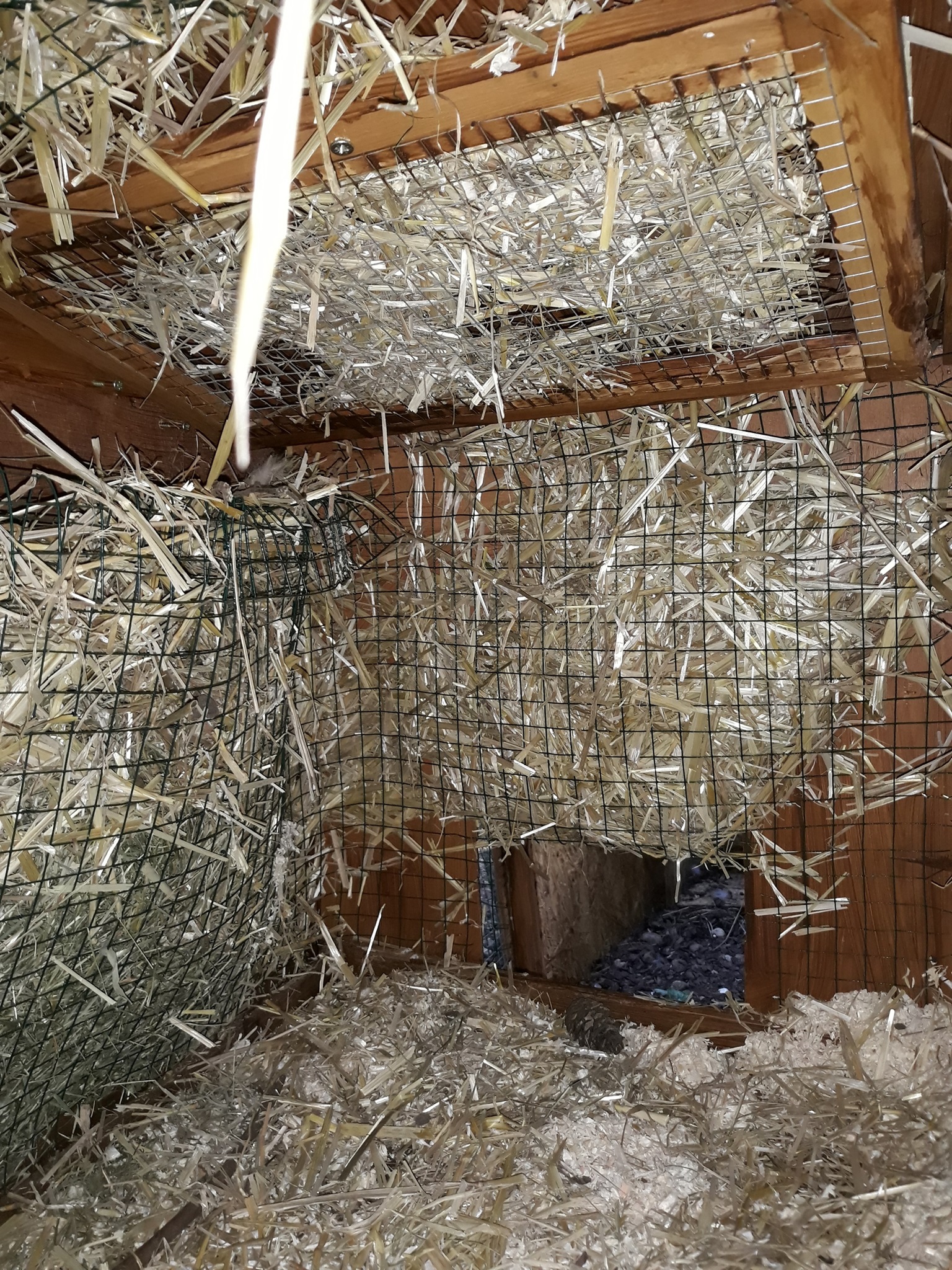 - Die Hütte sollte mindestens 5 cm hoch mit Sägespänen oder Holzpellets eingestreut werden, um einen ausreichenden Schutz gegen Bodenkälte zu bieten. Eine Schicht Stroh darüber optimiert die Isolation und steigert den "Komfort".