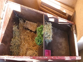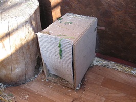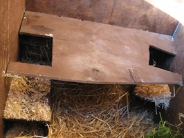 - Um das Entweichen der Wärme aus den Einschlupflöchern zusätzlich einzudämmen, sollten sie mit je einer elastischen Klappe versehen werden. Hierzu eignen sich z.B. zurechtgeschnittene Stücke aus einer Fußmatte oder einem alten Teppich, welche man oberhalb der Eingänge festnagelt.