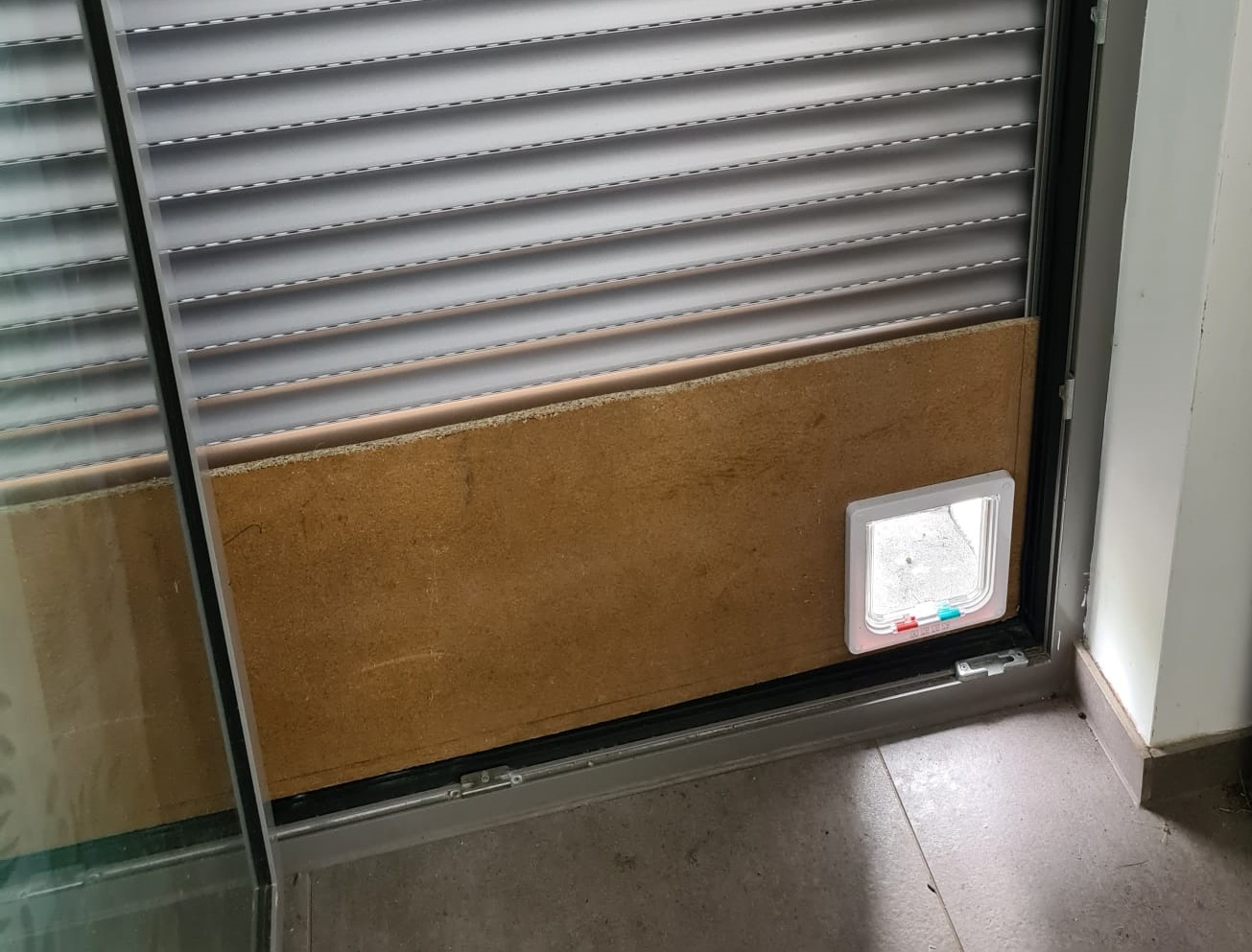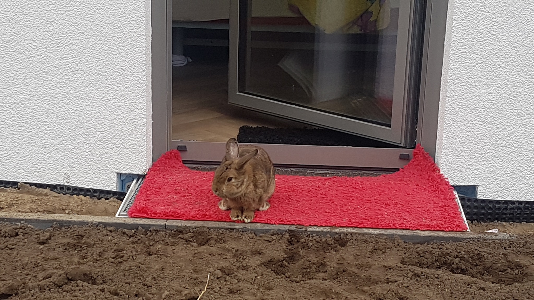 - Für Wohnungskaninchen lassen Sie idealerweise die Terrassentür offen, damit sie bei Bedarf ins Warme zurückkehren können. Ist dies nicht möglich, sollte der Gartenfreilauf nur unter Aufsicht erfolgen, damit Sie mitbekommen, wenn die Kaninchen herein möchten. Alternativ ist der Einbau einer Katzenklappe in die Terrassentür möglich. In Mietwohnungen kann die Klappe stattdessen entweder in ein türgroßes Brett gebastelt werden, das vor die offene Tür gestellt wird, oder in ein kleines Brett, das unter einen nicht komplett heruntergelassenen Rollladen gestellt wird (s. u. Bildergalerie).