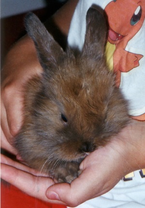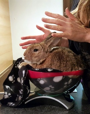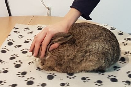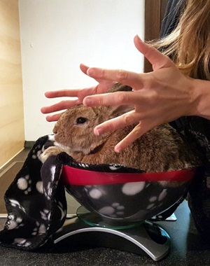 Hand über die Augen legen: Halten Sie das Kaninchen einhändig wie oben beschrieben. Die zweite Hand legen Sie über seine Stirn, sodass seine Augen bedeckt sind. Die Dunkelheit wirkt beruhigend auf das Kaninchen und es sieht nicht, wann sich der Boden nähert. Diese Methode eignet sich auch sehr gut, um das Kaninchen z.B. auf dem Behandlungstisch oder in eine Wiegeschale zu setzen. Beugen Sie sich beim Absetzen mit dem Oberkörper über das Kaninchen, sodass seine Wirbelsäule fixiert ist. Nehmen Sie die Hand erst von seinen Augen, nachdem Sie es abgesetzt haben.