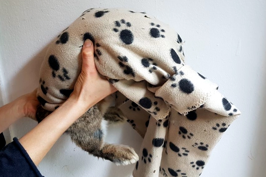 Alternativ können Sie das Kaninchen in eine Decke wickeln. Dies hat den Vorteil, dass sein ganzer Körper absolut sicher fixiert ist. Darüber hinaus ist diese Methode für das Tier angenehmer und weniger stressig, als wenn Sie es unmittelbar mit den Fingern greifen und es sich dadurch "gepackt" fühlt.