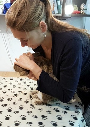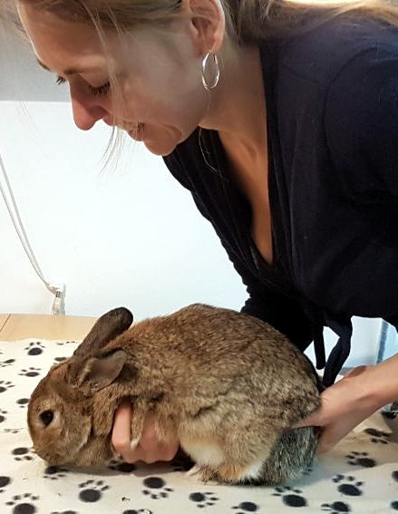 Diese Methode eignet sich auch hervorragend, um das Kaninchen für verschiedene Pflege- und Diagnostikmaßnahmen durch eine zweite Person zu fixieren (z.B. Krallenschneiden, Geschlechtsecken säubern, Anogenitalregion waschen, Fieber messen, ...).