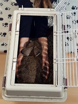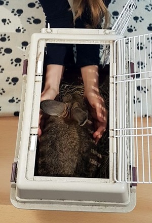 Beim Herausziehen stützen Sie seinen Brustkorb, indem Sie sanft Ihre Unterarmen zusammendrücken. Spreizt das Kaninchen beim Herausziehen die Beine zur Seite weg, sodass es droht, neben der Türöffnung hängen zu bleiben, drücken Sie mit den Fingern sanft seine Oberschenkel von der Seite an seinen Körper.