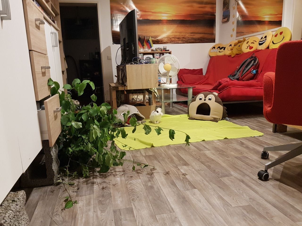Auch in der Wohnung ist artgerechte Kaninchenhaltung (gemäß Tierschutzgesetz mind. 6 qm Fläche für zwei kleine bis mittelgroße Kaninchen rund um die Uhr) realisierbar. Sie können den Kaninchen ein großflächiges Innengehege herrichten, ein komplettes Zimmer zur Verfügung stellen oder die Wohnung so sichern, dass sich die Kaninchen rund um die Uhr überall frei bewegen können, ebenso wie bei der Hunde- und Katzenhaltung. Zusätzlich können Wohnungskaninchen beaufsichtigten Gartenfreilauf bekommen.