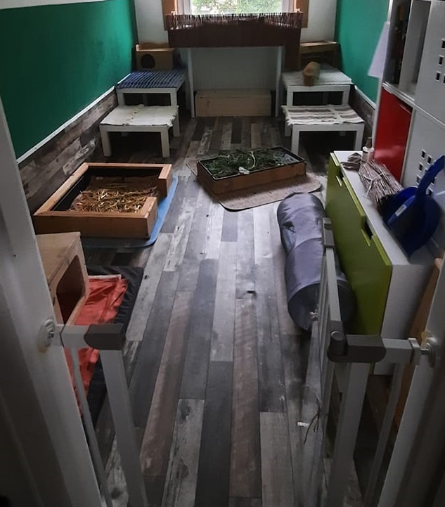 Eine weitere Möglichkeit ist die Aufstellung eines zimmergroßen Geheges, indem handelsübliche Metallgitter ringsum 1-2 cm von den Wänden entfernt aufgestellt und miteinander verbunden werden.