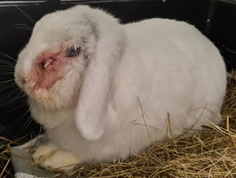 Auch Kaninchen mit einer Ohrenentzündung - meist Widder - haben oft Schmerzen beim Kauen.