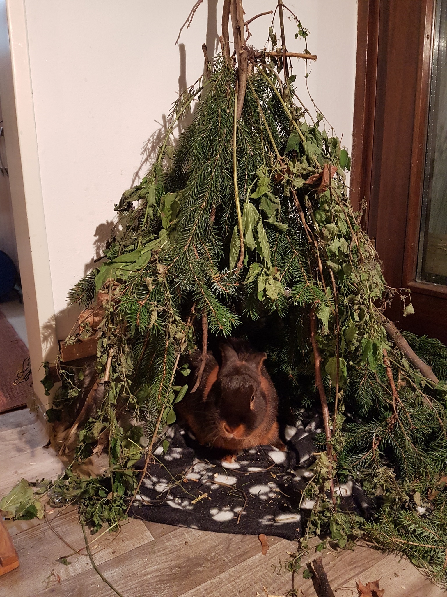 Frische Zweige sind nicht nur sehr gesund und befriedigen auf natürliche Weise das Nagedürfnis, sondern sie stecken auch voller interessanter Gerüche und bilden, wenn sie gebündelt aufgestellt oder über einen Unterstand gehängt werden, sehr beliebte Höhlen. Im Sommer kommen diverse Laubbäume in Frage, im Winter sind Tannen-, Kiefer- und Fichtenzweige ideal.
