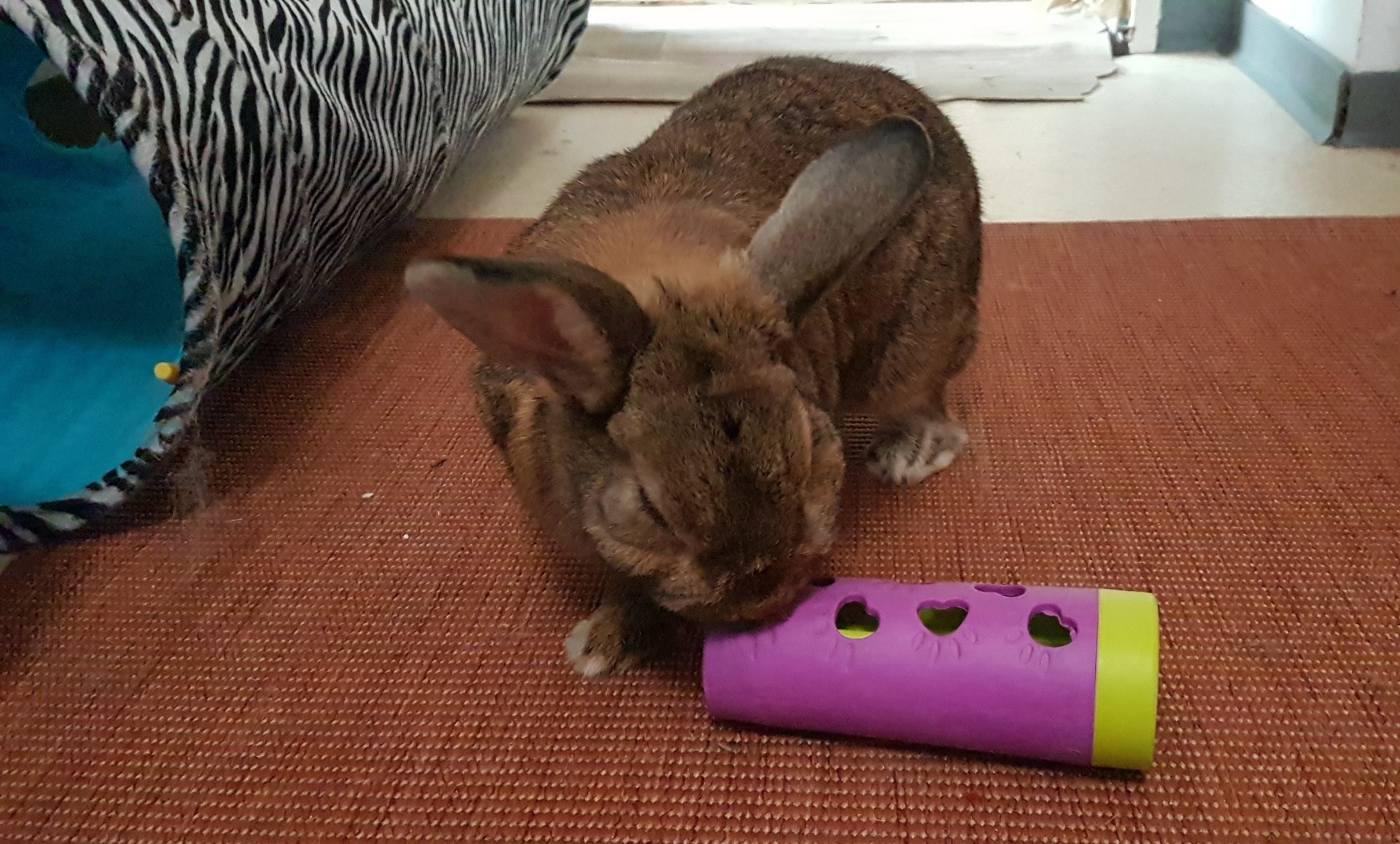 Im Zoofachhandel und im Internet erhältliche, mit kleinen Öffnungen versehene Bälle oder Rollen, die mit Leckerbissen (z.B. getrockneten Blüten) gefüllt werden. Werden sie vom Kaninchen umhergerollt, fällt das Futter heraus.