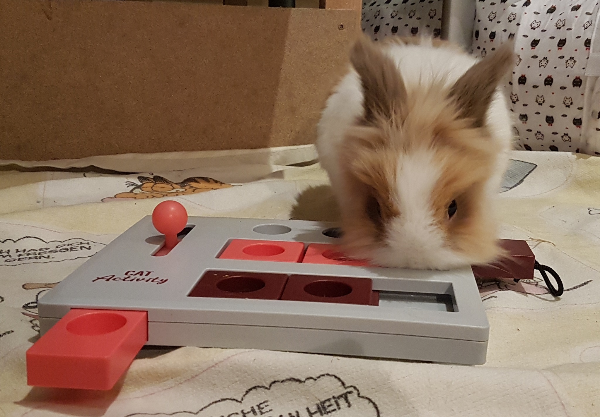 In Internetshops erhältliche Holzblöcke mit kleinen aufgesteckten oder per Scharnier angebrachten Deckelchen, unter denen Futterstückchen versteckt werden. Die Kaninchen gelangen erst an einen Leckerbissen, wenn sie das dazugehörige Deckelchen fortschieben oder mit den Zähnen greifen und beiseite legen.