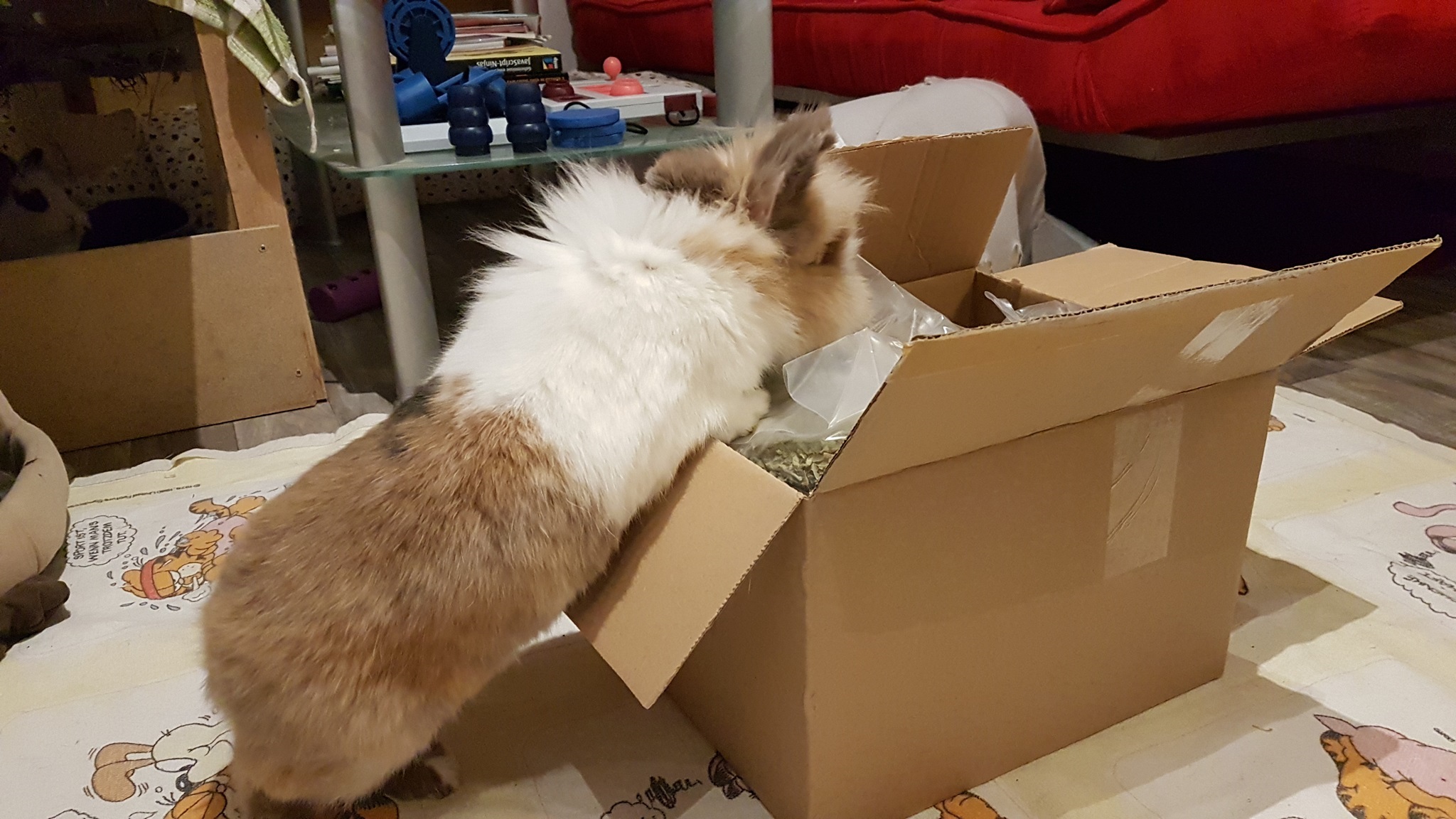 Achtung: Wohnungskaninchen entwickeln kein Winterfell. Wenn der Schnee zu schmelzen beginnt, sollte die Kiste entfernt werden, um nässebedingte Unterkühlungen zu vermeiden. Aus demselben Grund sollten sich die Kaninchen nicht in die Kiste legen.