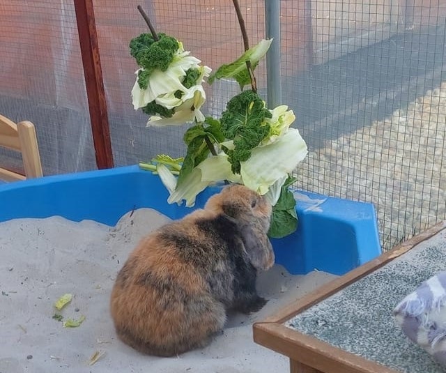 Kleine Mengen (!) Obst- und Gemüsestückchen auf einen spitzen Stock oder Metallstab gespießt, erhöht aufgehängt oder senkrecht in den Boden gesteckt, veranlassen die Kaninchen zu einer intensiven “Erarbeitung” ihres Futters.