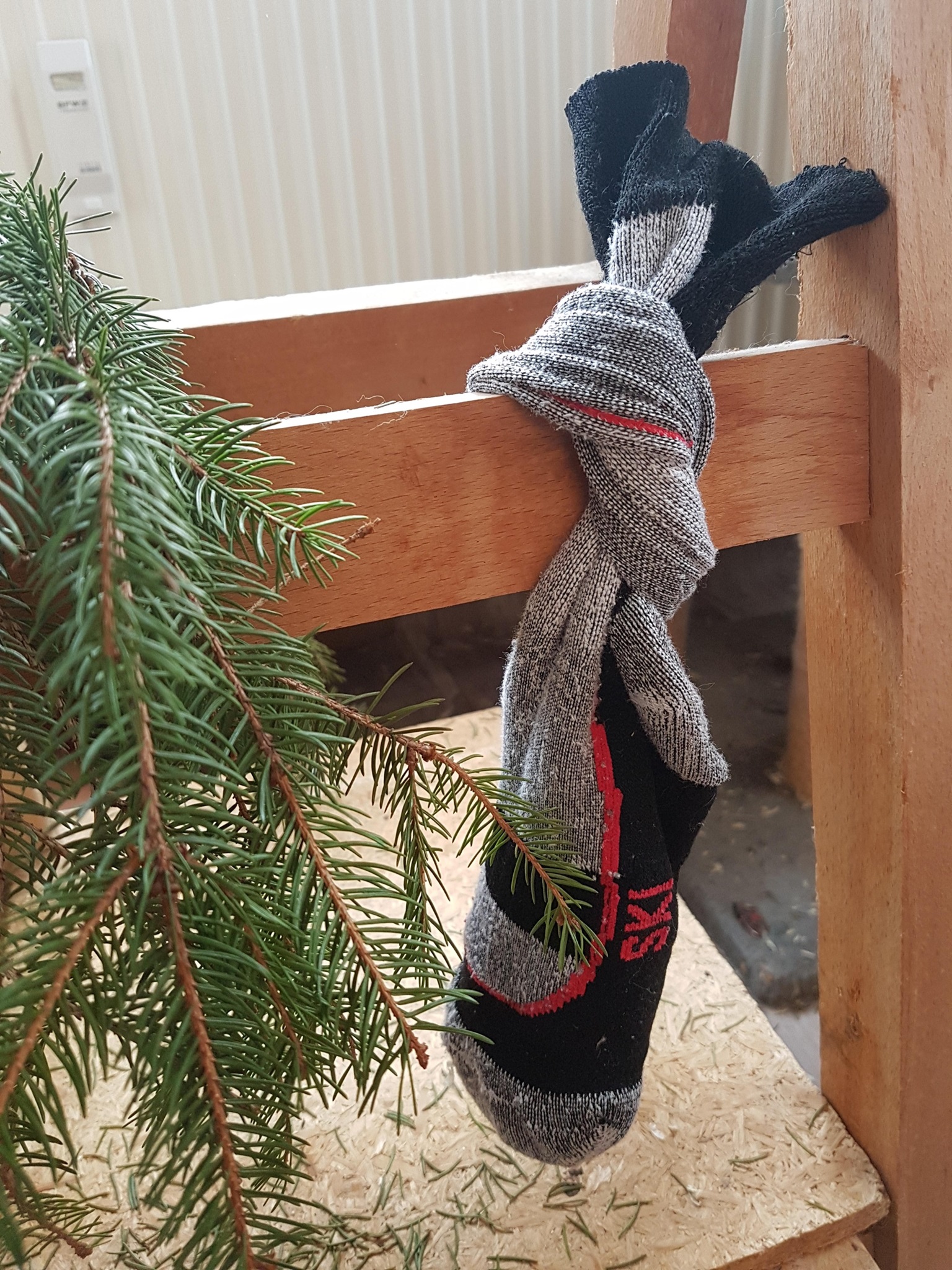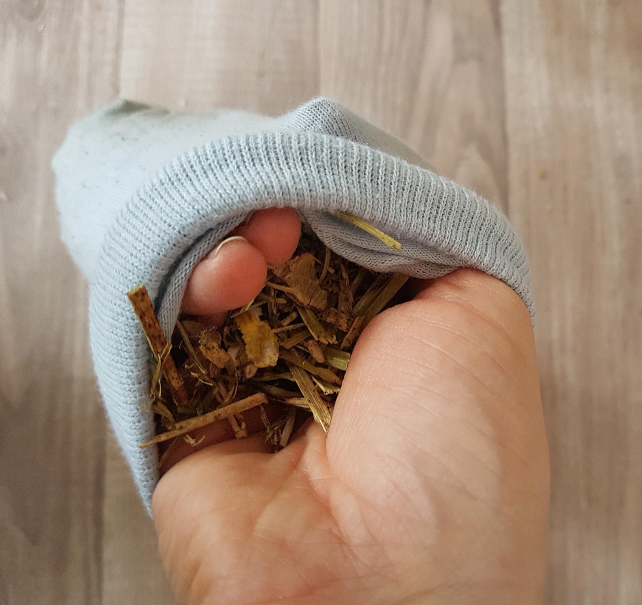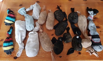 Eine mit Heu oder getrockneten Blättern oder Blüten gefüllte, zugeknotete Socke müssen die Kaninchen erst einmal "bearbeiten", um an den lecker duftenden Inhalt zu gelangen. Erhöht aufgehängt, müssen sie zusätzlich Männchen machen, was die Fitness fördert.
