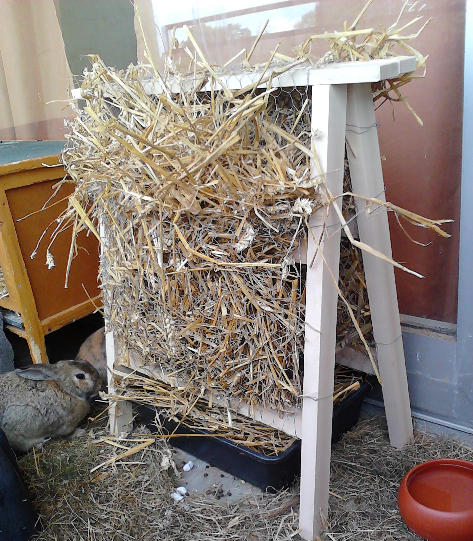 Hierfür wird ein Holzgestell (z.B. ein Holzbock aus dem Baumarkt) mit zwei Reihen Maschendraht umspannt, zwischen die Heu oder Stroh gefüllt wird. Es entsteht eine herrlich duftende und im Sommer angenehm kühle Höhle, von deren Wänden man jederzeit naschen kann. Lichtet sie sich allmählich, wird einfach aufgefüllt.