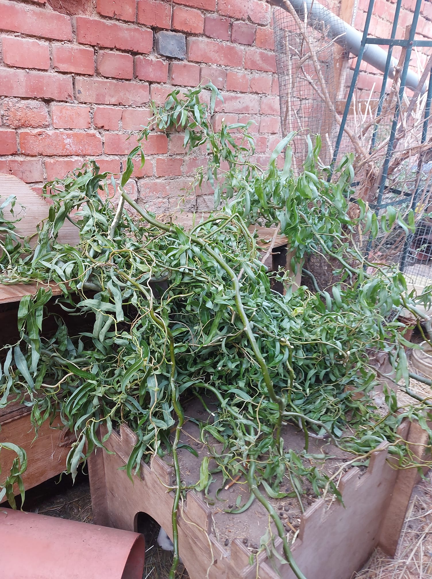 Eine quer gespannte Schnur oder Wäscheleine, an die verschiedene Zweige, Blätter und Kräuter geklammert werden: Eine solche "Kette" wird an zwei erhöhten Punkten befestigt, damit die Kaninchen sich ihr Futter durch Männchenmachen "erarbeiten" müssen.