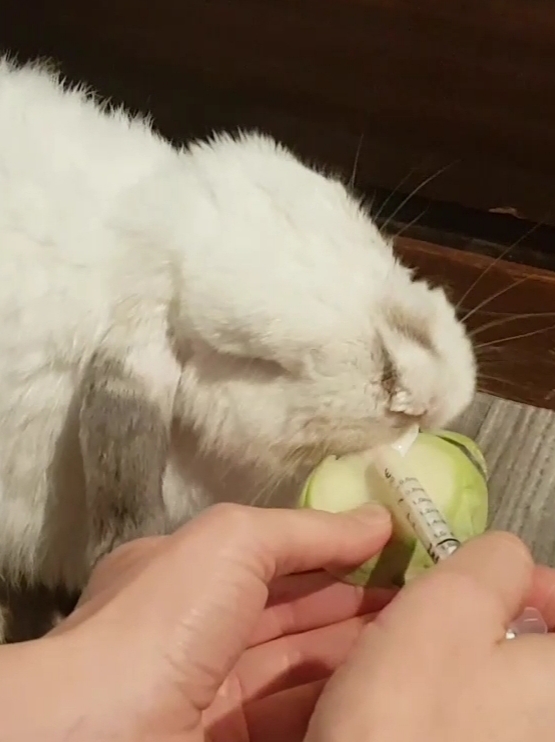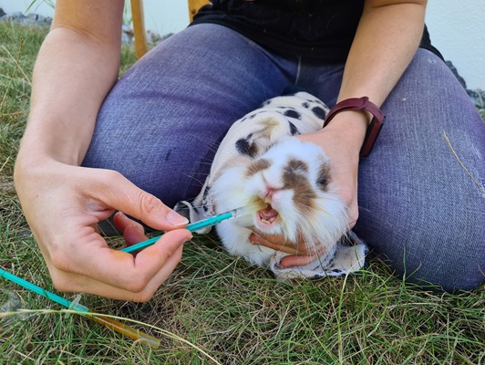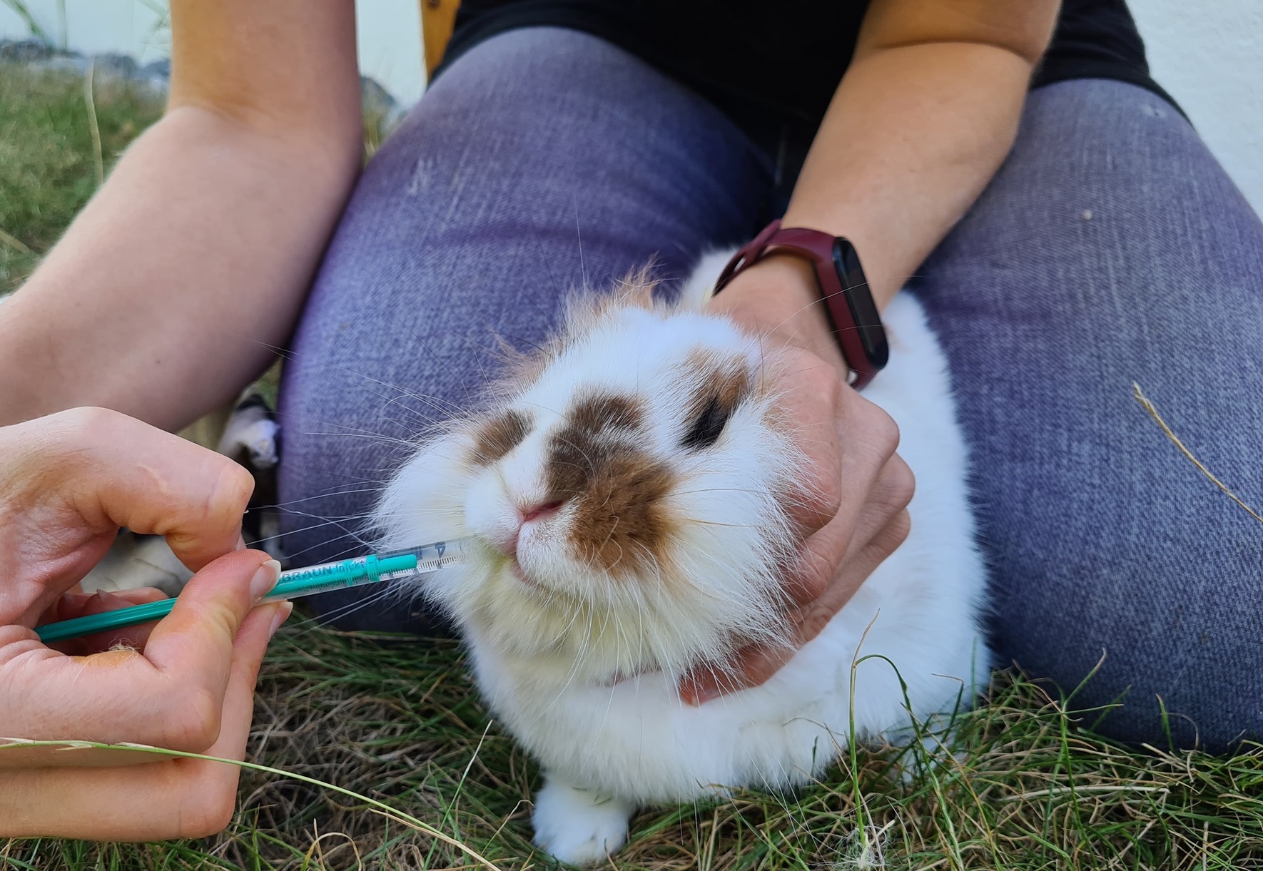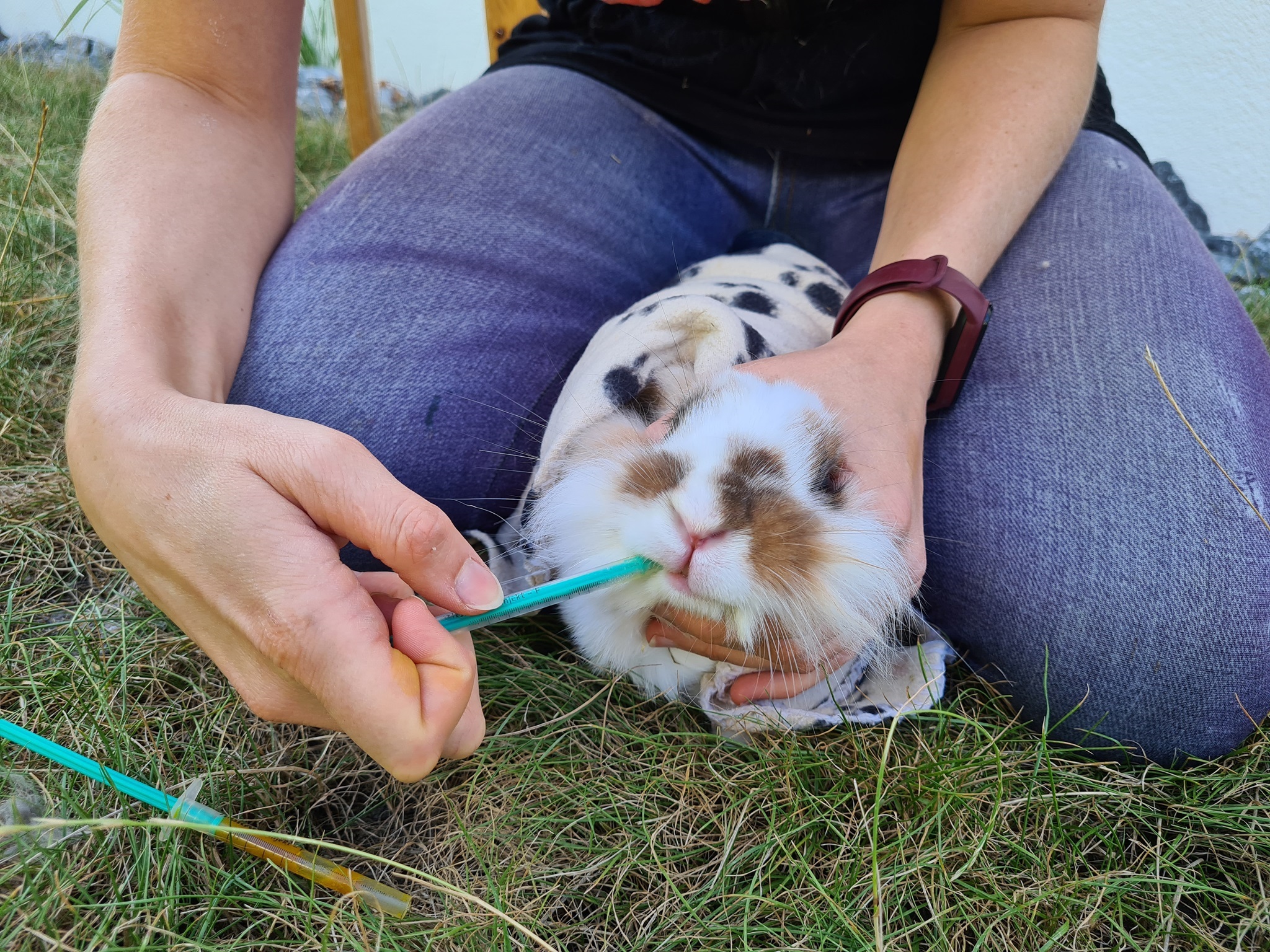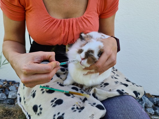 Frisst das Kaninchen das Futter mit dem Medikament nicht oder hat es generell keinen Appetit, ist eine "Zwangseingabe" notwendig. Eine solche kann auch standardmäßig durchgeführt werden, wenn das Kaninchen sich nicht dagegen wehrt, das Einführen der Spritze gut toleriert und das Medikament bereitwillig abschluckt.