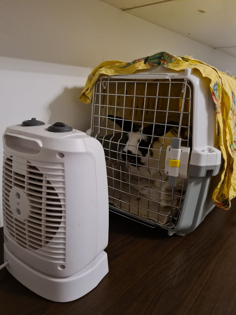 Für Heizlüfter gilt dasselbe wie für Rotlichtlampen: Sie sorgen für eine sehr schnelle und effektive Erwärmung, weshalb die Temperatur des Tieres in kurzen Abständen kontrolliert werden muss. Auch müssen sie soweit von der Box entfernt stehen, dass auch dann keine Verbrennungsgefahr besteht, wenn das Tier direkt am Gitter sitzt.