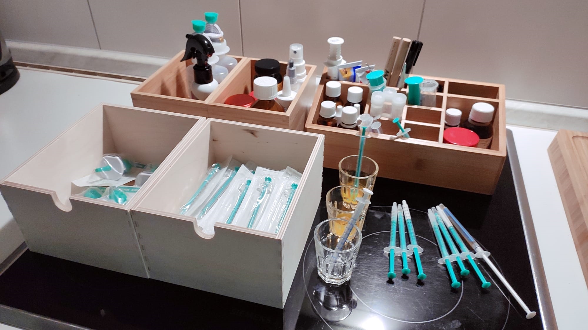 Zur Eingabe setzen Sie das Kaninchen mit dem Po in Ihre Richtung auf einen Tisch oder auf den Schoß, um ein Ausweichen nach hinten zu vermeiden. Die Spritze mit dem aufgezogenen Medikament sollte schon bereit liegen.