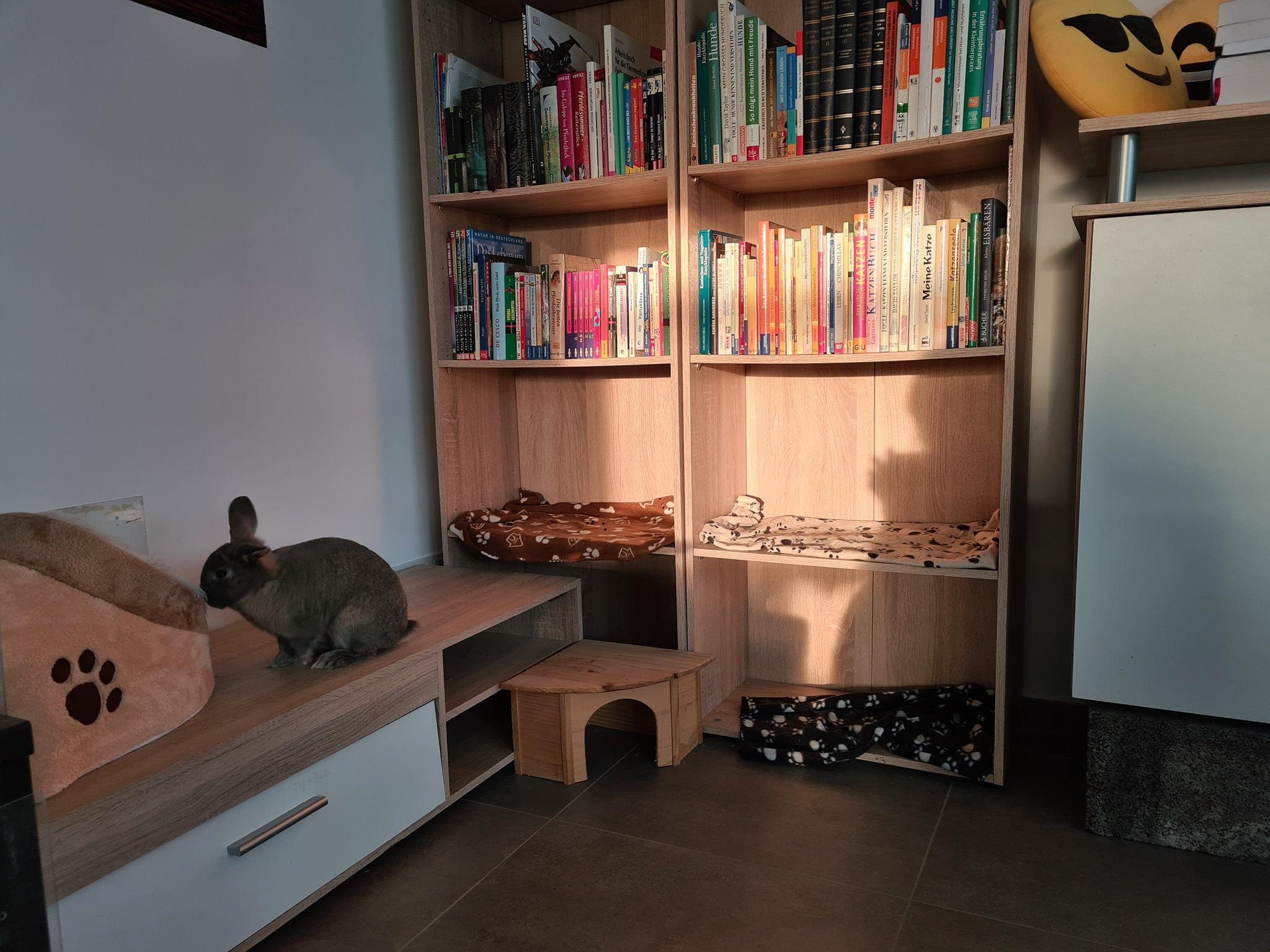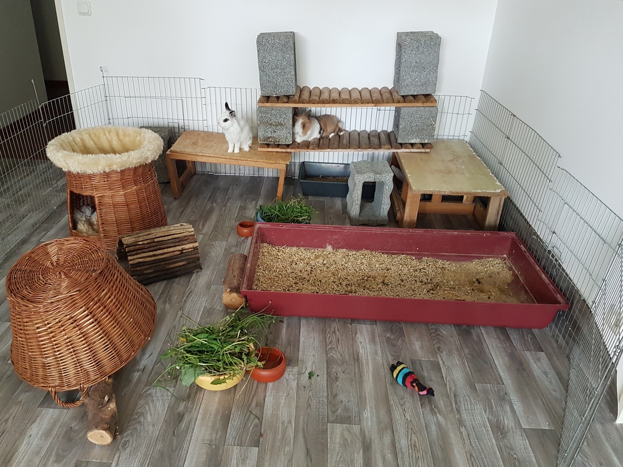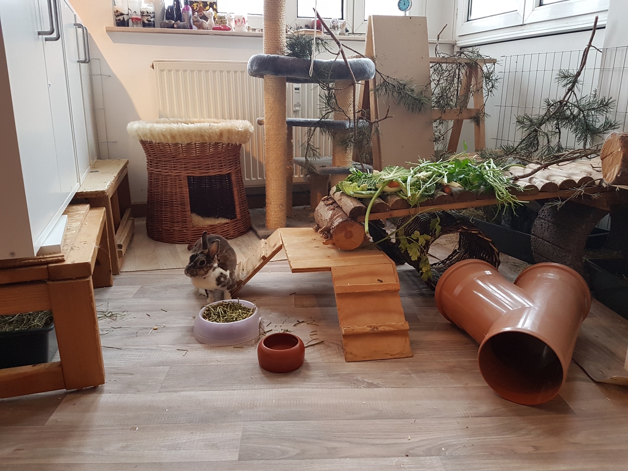 Ein ganzer Raum, der allein den Kaninchen zur Verfügung gestellt wird, setzt ausreichende Platzverhältnisse voraus, bietet den Tieren aber mit ausreichend Strukturierung einen herrlichen Abenteuerspielplatz.