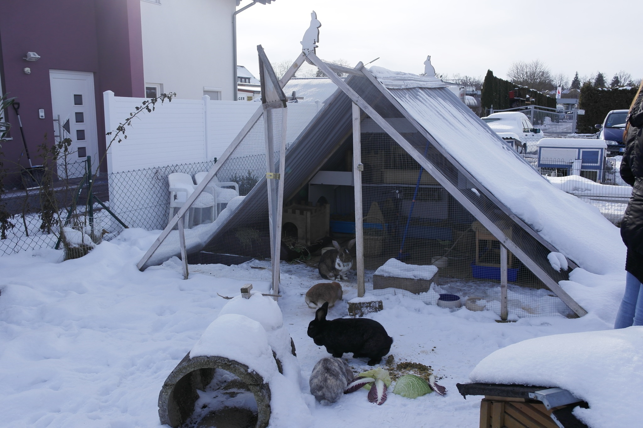 Sollte ein Kaninchen in Winteraußenhaltung erkranken, muss es evtl. gemeinsam mit mindestens einem Artgenossen vorübergehend ins Haus geholt werden.
